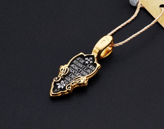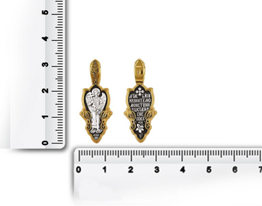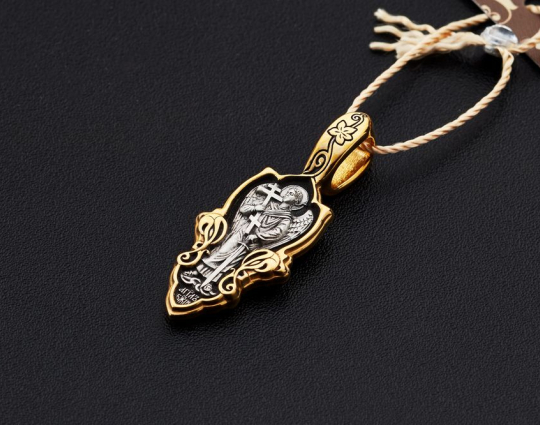 Изящная серебряный образок с позолоченной окантовкой и изображением Ангела-Хранителя, держащего крест и меч. Считается, что так Ангел охраняет человека от нападений физического и духовного плана. На обратной стороне написаны слова, с которыми Ангела просят о помощи.