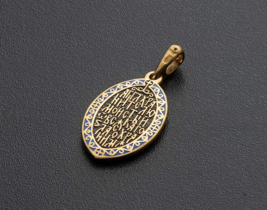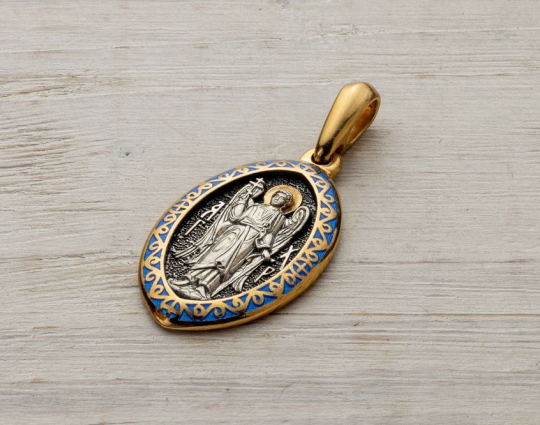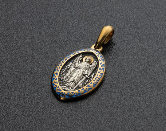 Образок выполнен из серебра 925 пробы с позолотой. На обратной стороне находятся слова молитвы: "Ангел Хранителю мой святый, от всякого зла сохрани мя".