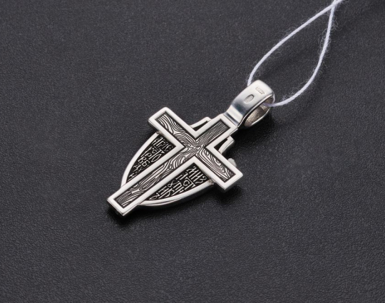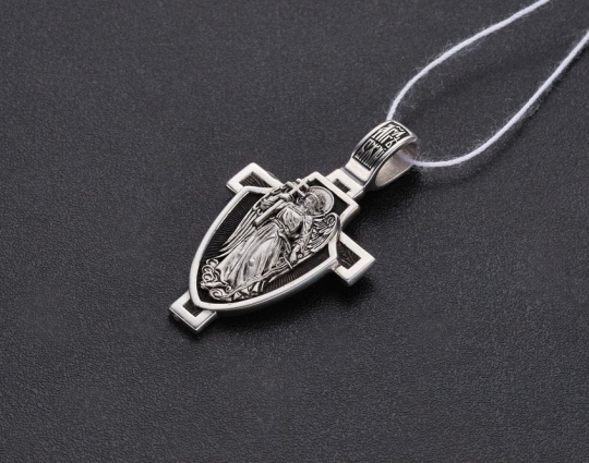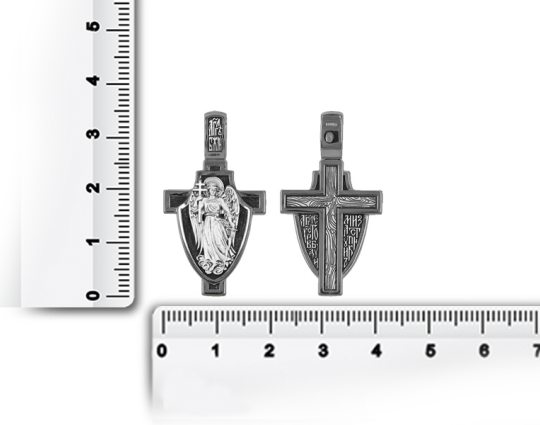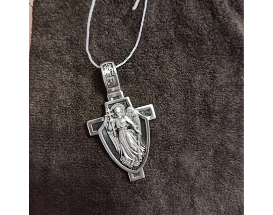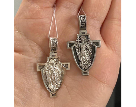 Образок выполнен в виде щита, который закрывает собой крест. На щите расположен Ангел-Хранитель. Тот самый Ангел, который появляется рядом с каждым человеком после Крещения. Он его охраняет, наставляет и направляет. Защищает его душу от злых духов и тяжких грехов.