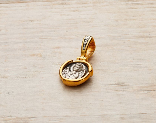 На образке из серебра с позолотой изображен Ангела - Хранителm, покровителm и наставник, который есть у каждого верующего человека. Он оберегает от всякого зла, если просить защиты с искренней верой, наставляет христиан в вере и благочестии, охраняет их души и тела, заступается за них в течение земной их жизни.