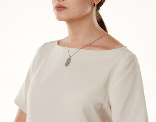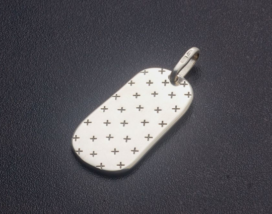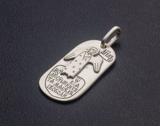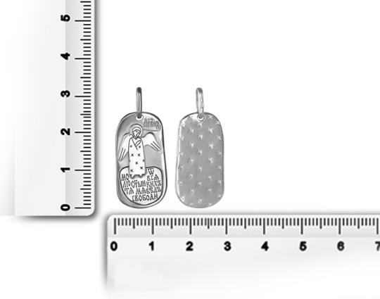 Милое, по-детски наивное изображение Ангела-Хранителя закреплено на серебряной продолговатой пластине. Ангел появляется рядом с каждым человеком после Крещения. Он его охраняет, наставляет и направляет. Защищает его душу от злых духов и тяжких грехов. Внизу набита молитва, с которой к нему чаще всего обращаются. Оборотная сторона украшена мелкими резными звездочками.