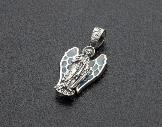 Серебряный образок состоящий из фигуры Ангела - Хранителя. В православной церкви с древних времен Ангел считается защитником человека. В руках Ангел держит крест, они символизируют его поклонение Богу и желание защищать людей от злых духов.
