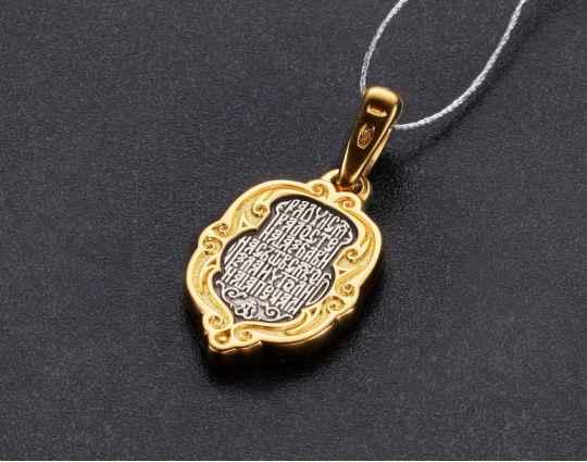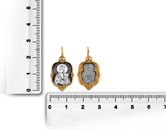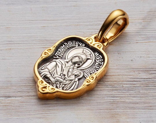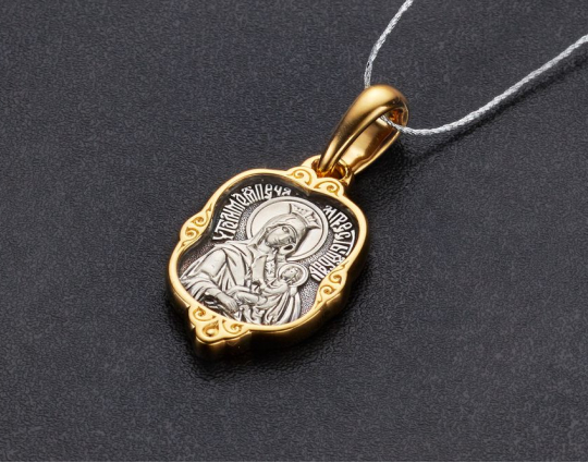 Изящный образок с позолоченным контуром и иконой «Утоли моя печали», на которой изображена Божья Матерь и младенец Иисус. Мать так обнимает Сына, как будто просит у него утешения для всех скорбящих и печалящихся. В руках младенца свиток со словами: Суд праведный судите, милость и щедроты творите...