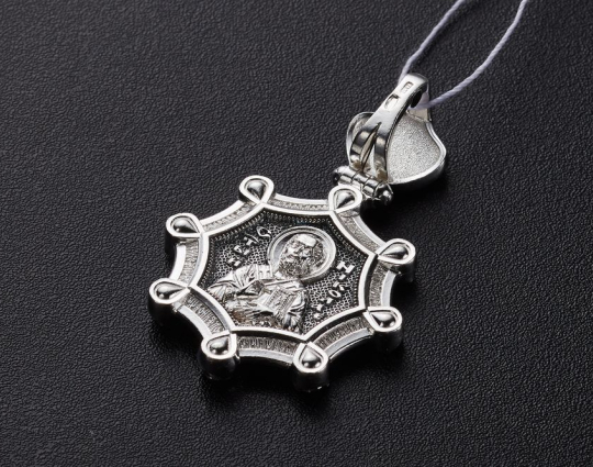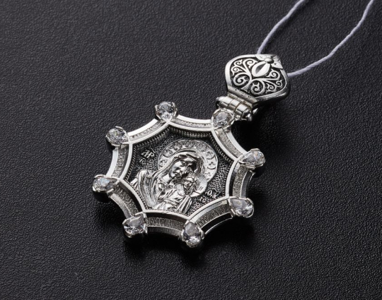 Серебряный образок необычной формы с каплевидными вставками из камней.  На лицевой стороне размещено изображение Казанской иконы Пресвятой Богородицы. Это одна из самых почитаемых святых в России. С ней связывают много случаев чудесного исцеления и устроения личной жизни,  к ней обращаются, когда нужно найти ответ на сложный вопрос.