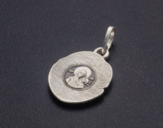 Образ Богоматери Казанской выполненный на тонкой, аккуратной пластинке, напоминающей трепещущий лепесток розы. Это подчеркивает хрупкость Святой, ее благородство.