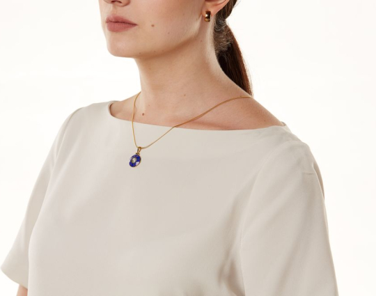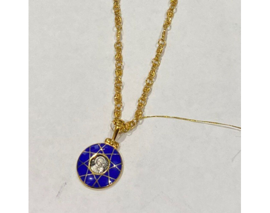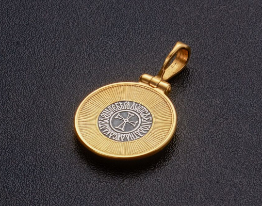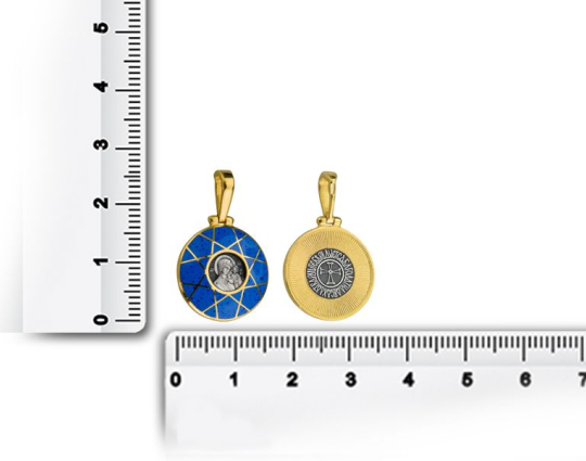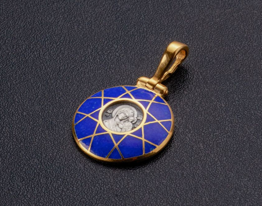 Круглый образок с иконой Божией Матери Казанской в центре и позолоченной окантовкой с ультрамариновыми эмалевыми вставками. Обратную сторону образка украшает серебряный круг с надписью.