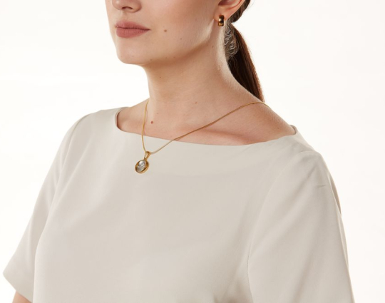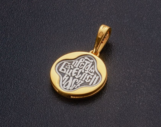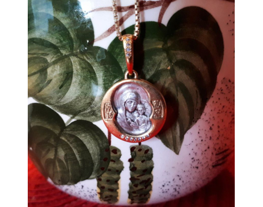 Круглый образок с иконой Божией Матери Казанской в центре и с массивной позолоченной окантовкой. Обратную сторону образка украшает молитва.