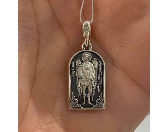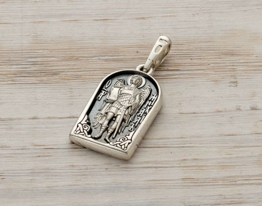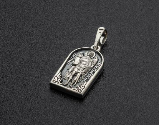 На обратной стороне изображен Архангел Михаил, предводитель небесного воинства, архангел, оберегающий души от любого проявления зла.