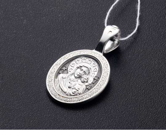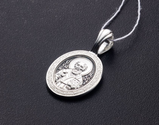 Овальный образок из серебра с изящным узором по контуру и изображением Николая Чудотворца на лицевой стороне. Он один из самых почитаемых святых на Руси. У него просят защиты от болезней, помощи в путешествии, учебе и в поиске достойного супруга.