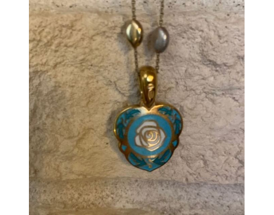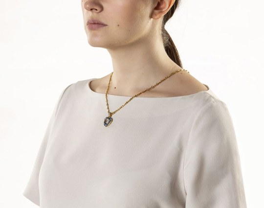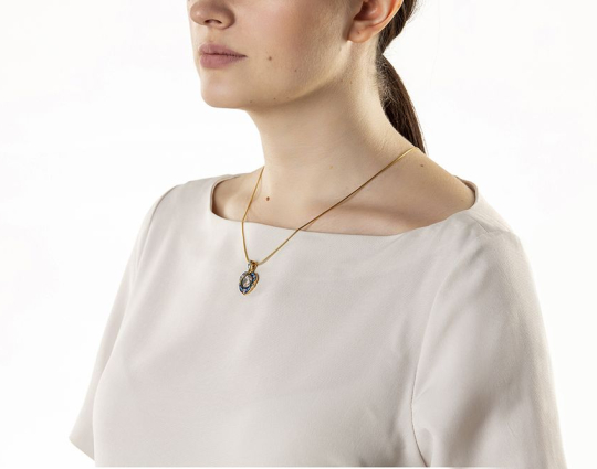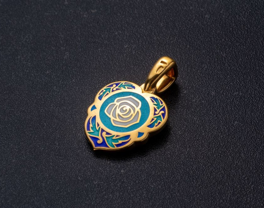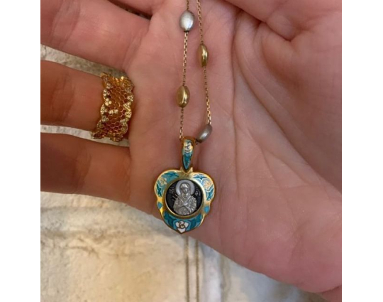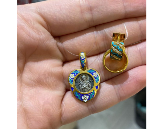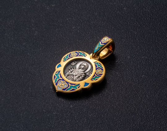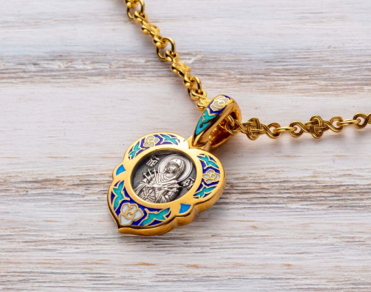 Изящный женский образок из серебра с отделкой из позолоты и эмалевой росписью. На лицевой стороне в цветы помещен образ Богоматери, воплощенный в икону «Семистрельная». На ней Богоматерь изображена с сердцем, проткнутым семью мечами. Это символизирует боль и горе Богородицы в земной жизни, поэтому верующие просят перед этим образом избавления от недобрых мыслей, вспышек собственного и чужого гнева, нетерпимости и любого вида вражды.