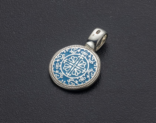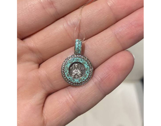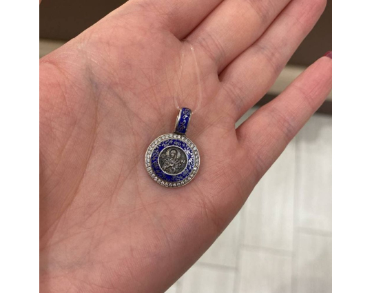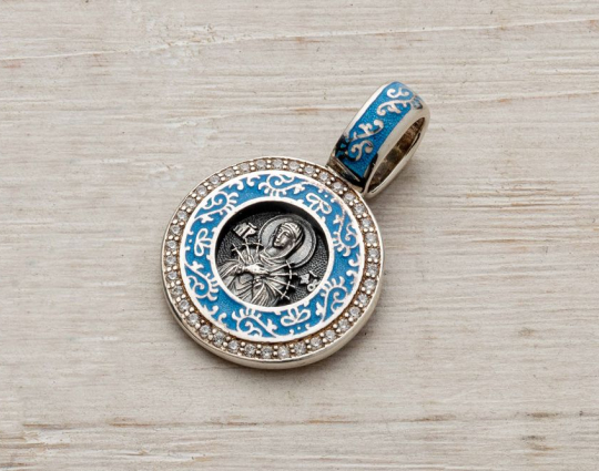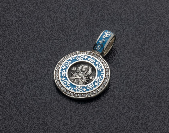 Образок "Семистрельная икона Богородицы" темно - голубой | 02_078A_blackcyan | Серебро 925 пробы, эмаль, фианиты