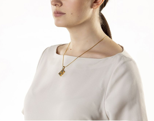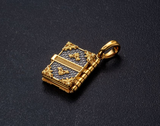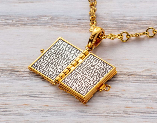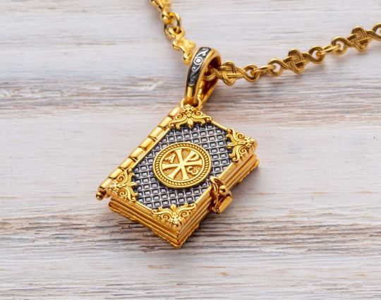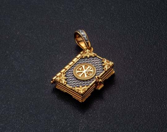 Изящный складень - молитвенник, выполненный из серебра и украшенный позолоченными элементами на обложке.  На лицевой части обложки помещен древнейший знак Христа - Хризма. Он состоит из первых двух букв его имени, которые дополнены первой и последней буквами греческого алфавита. Это означает то, что Господь Бог будет сопровождать каждого человека с рождения до последнего вздоха. Внутри – «Псалом 90». Считается, что сама молитва может быть мощной защитой. Ее читают при опасности, в скорби, при жизненных трудностях. В древние времена  русские солдаты даже переписывали Псалом от  руки и зашивали в одежду.
