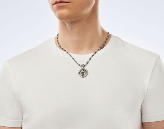 Лицевая часть этого серебряного образка с родиевым покрытием заполнена изображением Распятия Иисуса и теми, кто был с ним на казни Его.