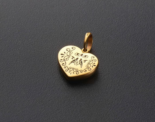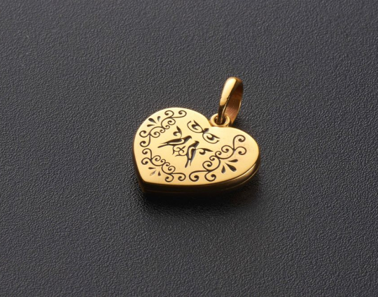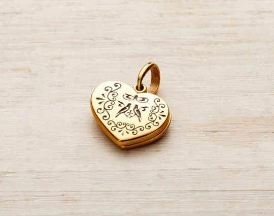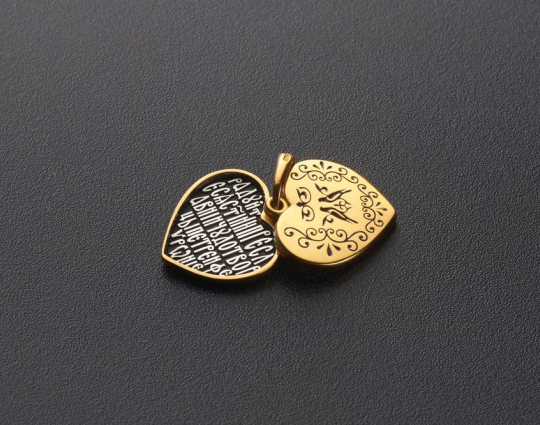 Сердечко состоит из двух частей. На одной находятся образы святых, на второй - слова молитвы, с которыми можно к ним обратиться. На внешних сторонах подвески из серебра с позолотой в окружении растительного орнамента изображены два голубя - это символы чистоты, верности и непорочной любви.