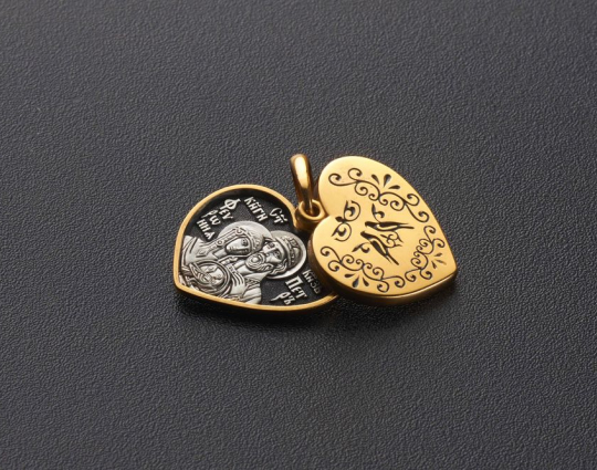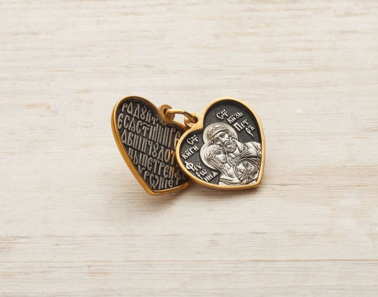 Серебряный образок выполнен в виде сердца. Это символ духовной красоты и верности супружества. Внутри подвески изображены Святые Пётр и Феврония. Супруги известны своей преданностью, настоящей и взаимной любовью. Это настоящий пример сохранения брака, гармонии и взаимопонимания. Этим святым молятся о мире в семье, укреплении семейных уз и достижения семейного счастья и благополучия.