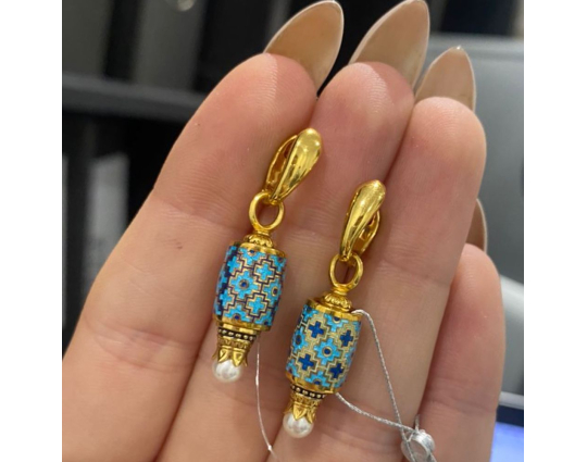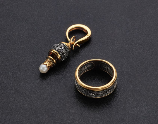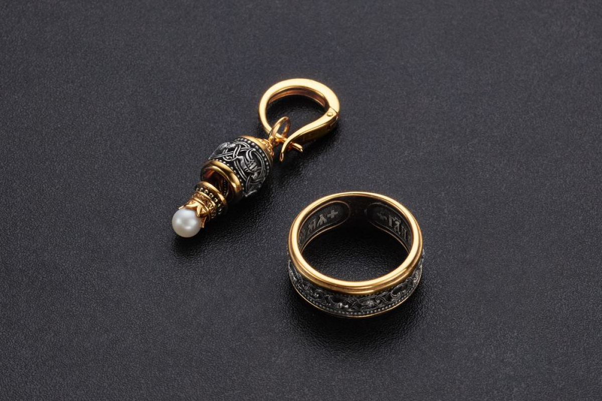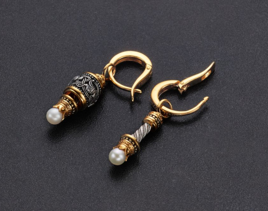 Набор серьги с жемчугом, кольцо с орнаментом, 2 бусины с птичками | 60021_4014_2X5019 | Серебро 925 пробы с позолотой