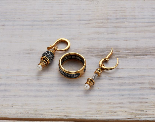 Изящный набор из сережек и кольца из серебра и отделкой позолотой.  Кольцо украшено орнаментом из птиц на черненом фоне. Внутри кольца - слова - обращения к Богу.