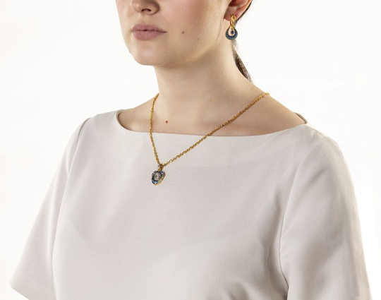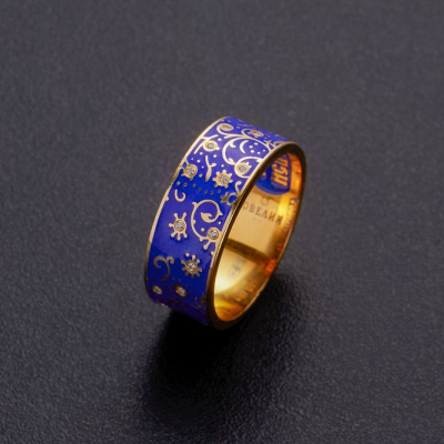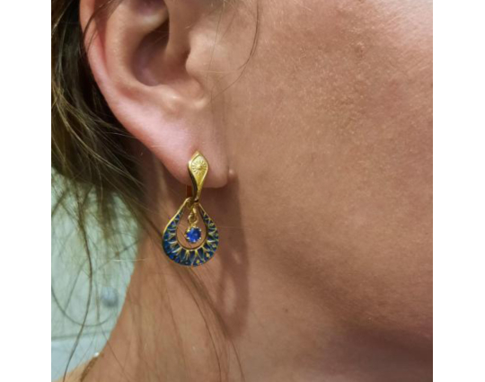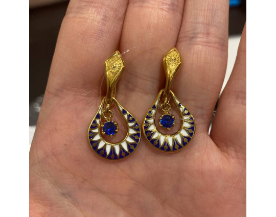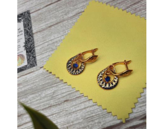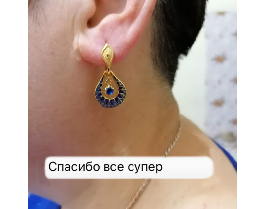 Серьги из серебра, украшенные позолотой и эмалевой росписью. Форма сережек напоминает полумесяц, а роспись, которой они украшены – солнечные лучи. Этот орнамент выбран неспроста, ведь с древних времен Женщина считалась хранительницей очага, которая словно Солнце своим теплом, своей любовью одаривает всех членов семьи.