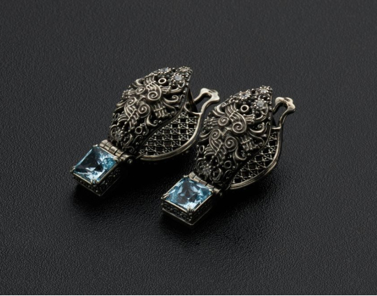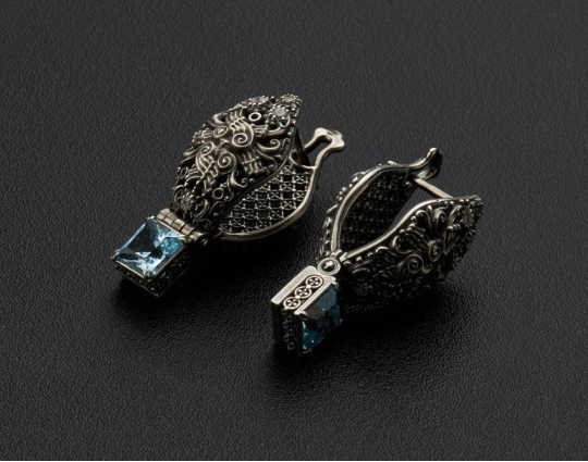 Серьги выполнены из серебра 925 пробы. Они украшены шестью топазами. По одному крупному камню голубого цвета 6*6 мм и по 4 бесцветных меньшего размера на каждую серьгу.