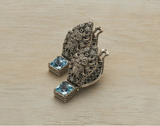 Серьги лёгкие, охватывают мочку уха с двух сторон. Орнамент выполнен в виде херувимов, которые охраняют врата женской души — ее уши. С внешней стороны находятся ангельские крылья, а с внутренней — решетка, сотканная из традиционного орнамента «крест в круге».