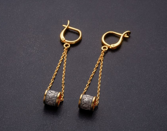 Позолоченные серьги - цепочки с подвесками из бусин, которые украшены узором из сплетенных ветвей виноградной лозы и птиц, сидящих на них. Считается, птицы - это души людей, которые стремятся к Богу, к вере. Лоза и виноград- символ Христа и его учеников.