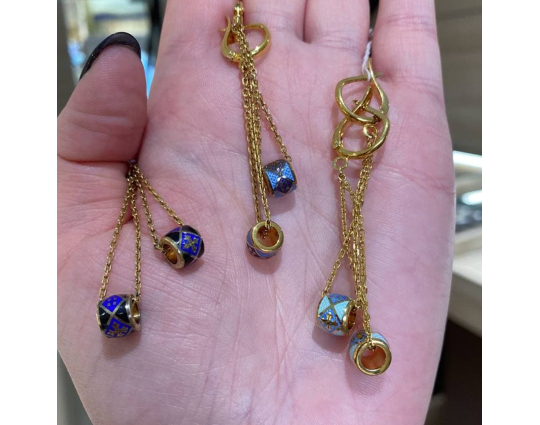 Позолоченные серьги - цепочки с подвесками из бусин с эмалевой росписью в виде орнамента, который состоит из ромбиков лазурного цвета с позолоченным декором внутри и светло-голубого фона. Цепочки крепятся на небольшое кольцо, которое соединяет их с застежкой, имеющей простую и надежную конструкцию.