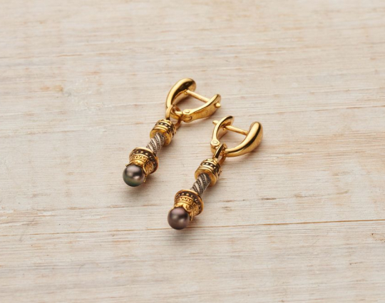 Серебряные серьги с чёрным жемчугом и позолоченными элементами. Конструкция сережек позволяет их носить как отдельное ювелирное изделие, так и дополнять любыми бусинами из нашего магазина, получая, таким образом, каждый раз новое украшение.
