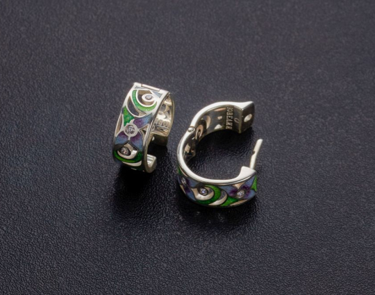Изящные резные серебряные серьги с растительным орнаментом, который расписан эмалью разных цветов. Это создает эффектную игру цвета на серьгах. Кроме того, они дополнены фианитами, что тоже подчеркивает их изящество.