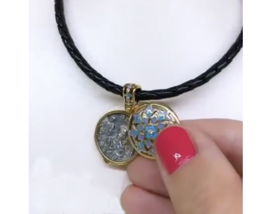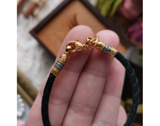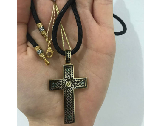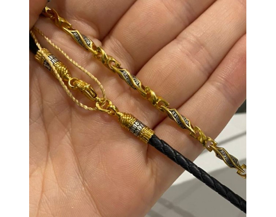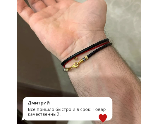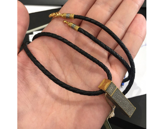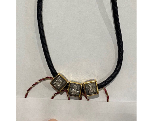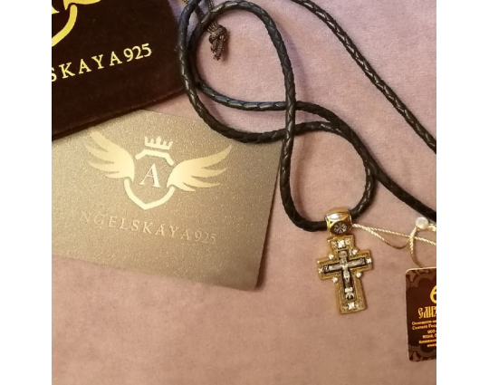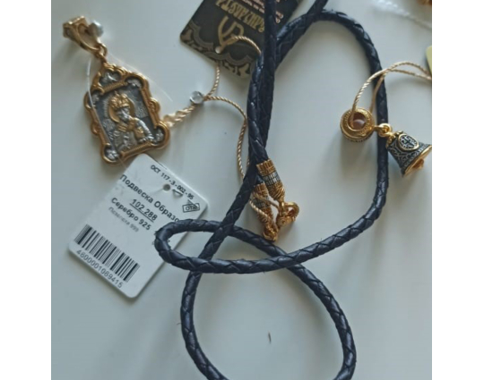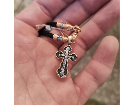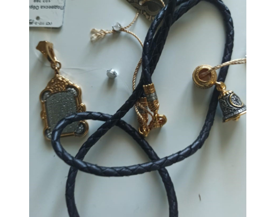 На его концах - специальные серебряные с позолотой зажимы в форме куполов. На них написаны слова – обращения к Богу. Замком служит несъемный позолоченный карабин. Концевик с другой стороны шнурка можно снять самостоятельно для того, что бы повесить какое - то украшение или укоротить его, при необходимости.