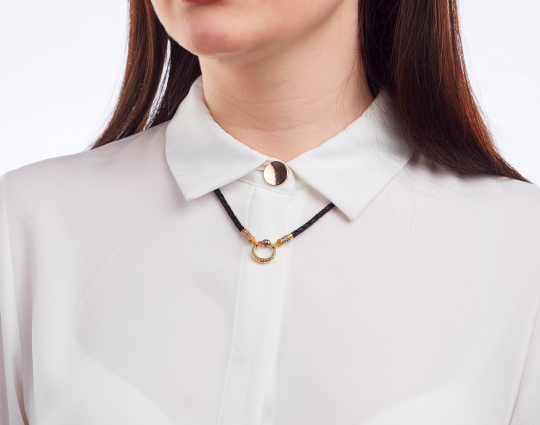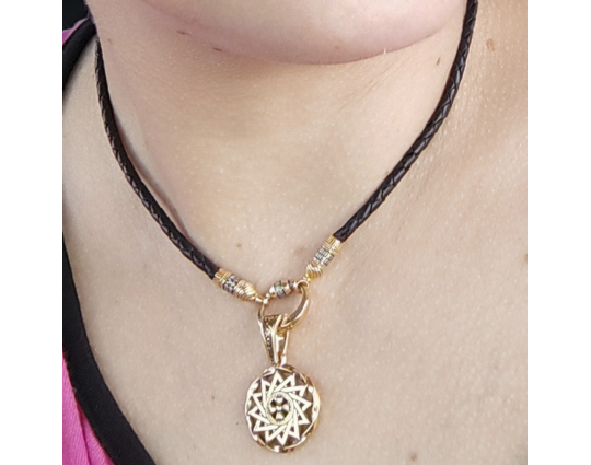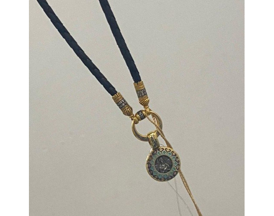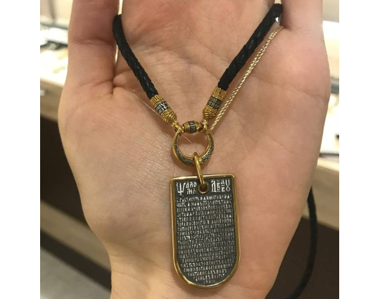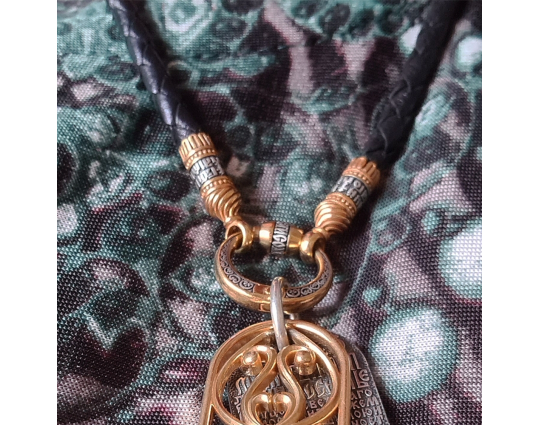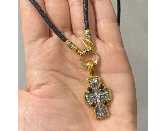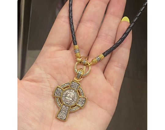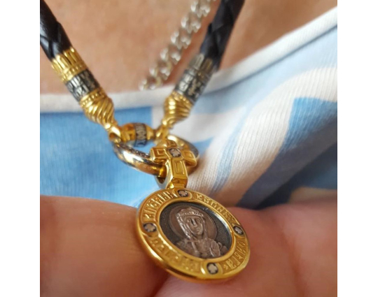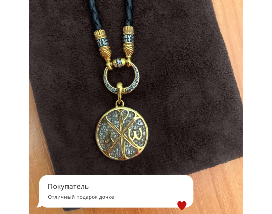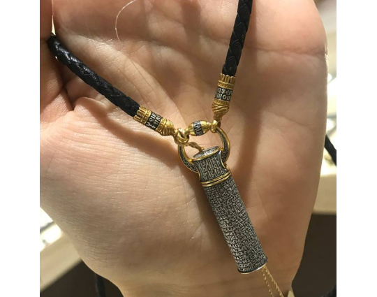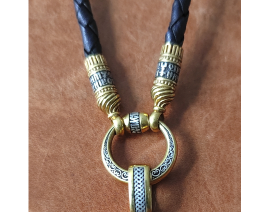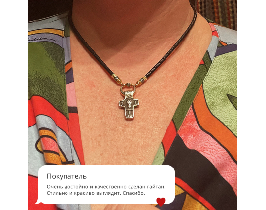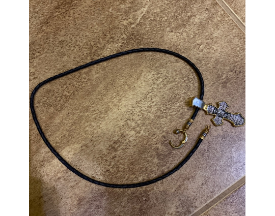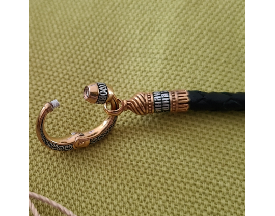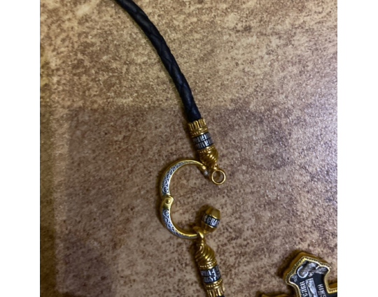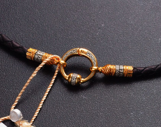 На его концах - специальные серебряные с позолотой зажимы в форме куполов. На них написаны слова – обращения к Богу. Замком служит съемное кольцо- переходник с узором. Это византийский орнамент -символ чистоты и верности.