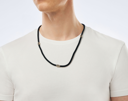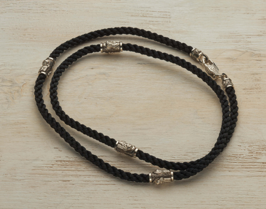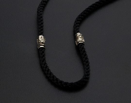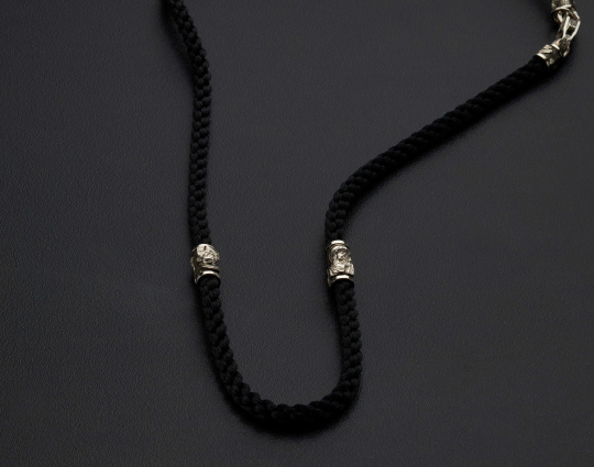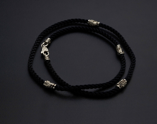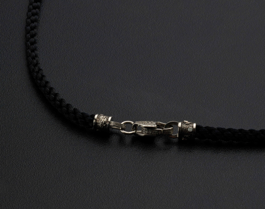 Нейлоновый плетеный шнурок ручной работы, который отличается особой прочностью толщиной 5 мм с 4 серебряными вставками, 2 окончания и серебряным замком.