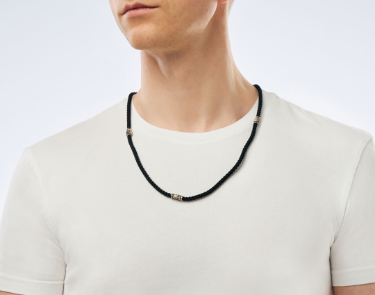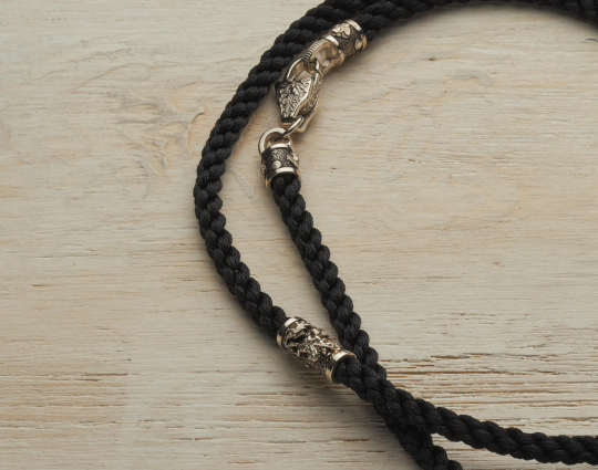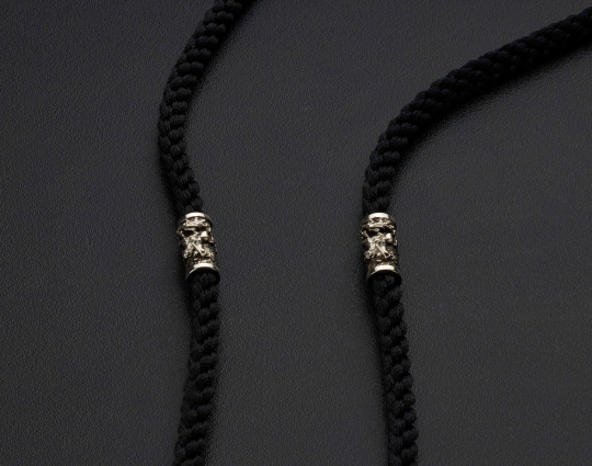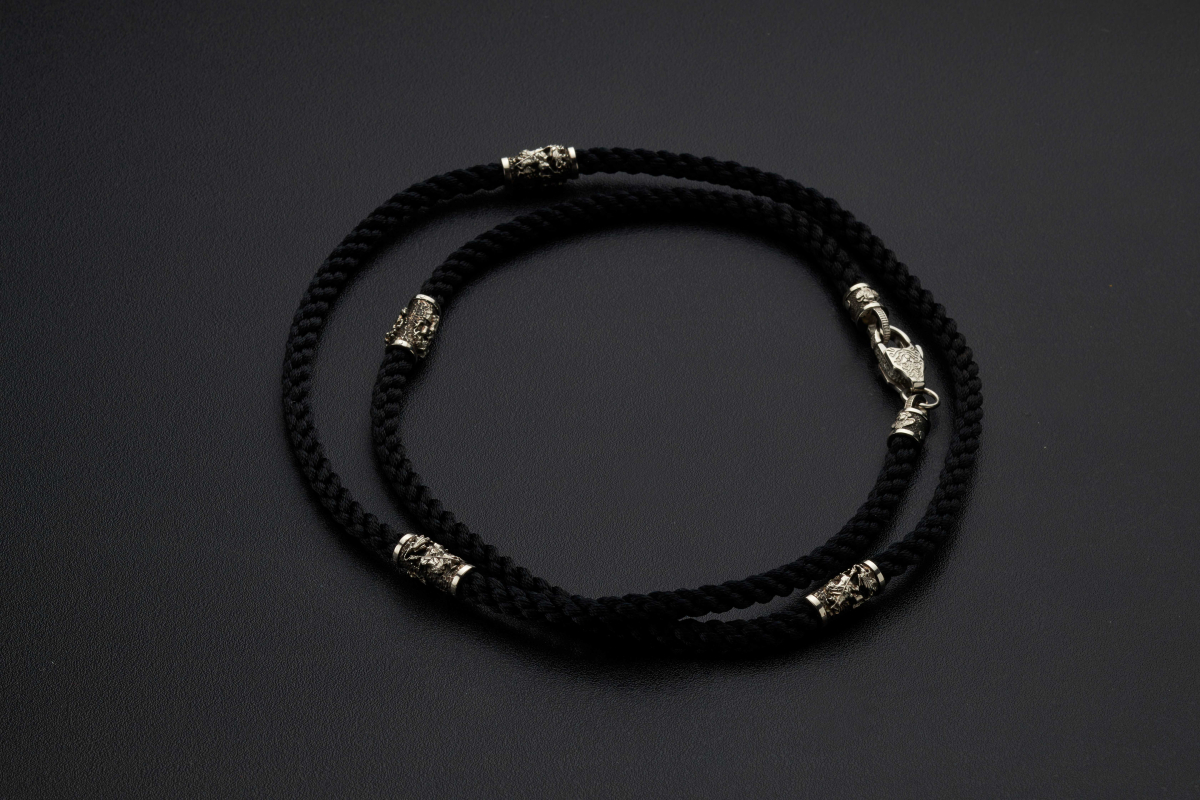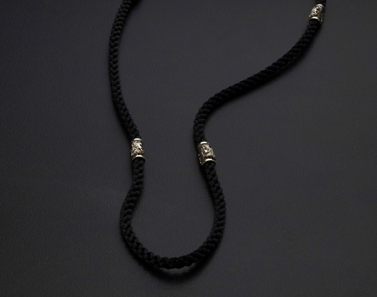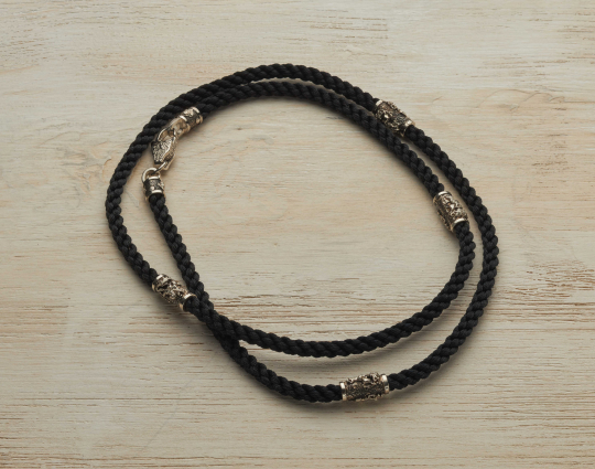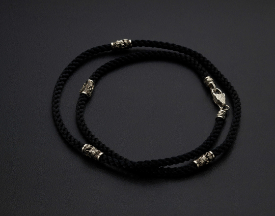 Нейлоновый плетеный шнурок ручной работы, который отличается особой прочностью. Толщиной 5 мм с 4 серебряными вставками, 2 окончаниями и серебряным замком.