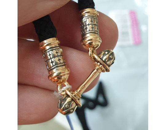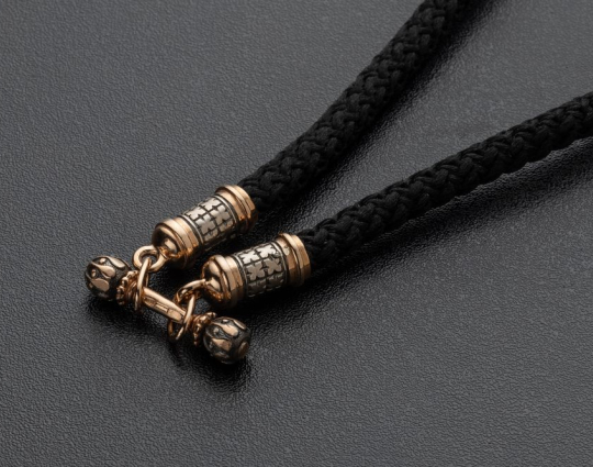Текстильный шнурок с концевиками цилиндрической формы и переходником из серебра 925 пробы. Переходник выполняет функцию надежного замочка.  Гайтаны с подобным замком довольны комфортны при надевании и ношении изделий.