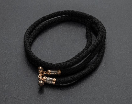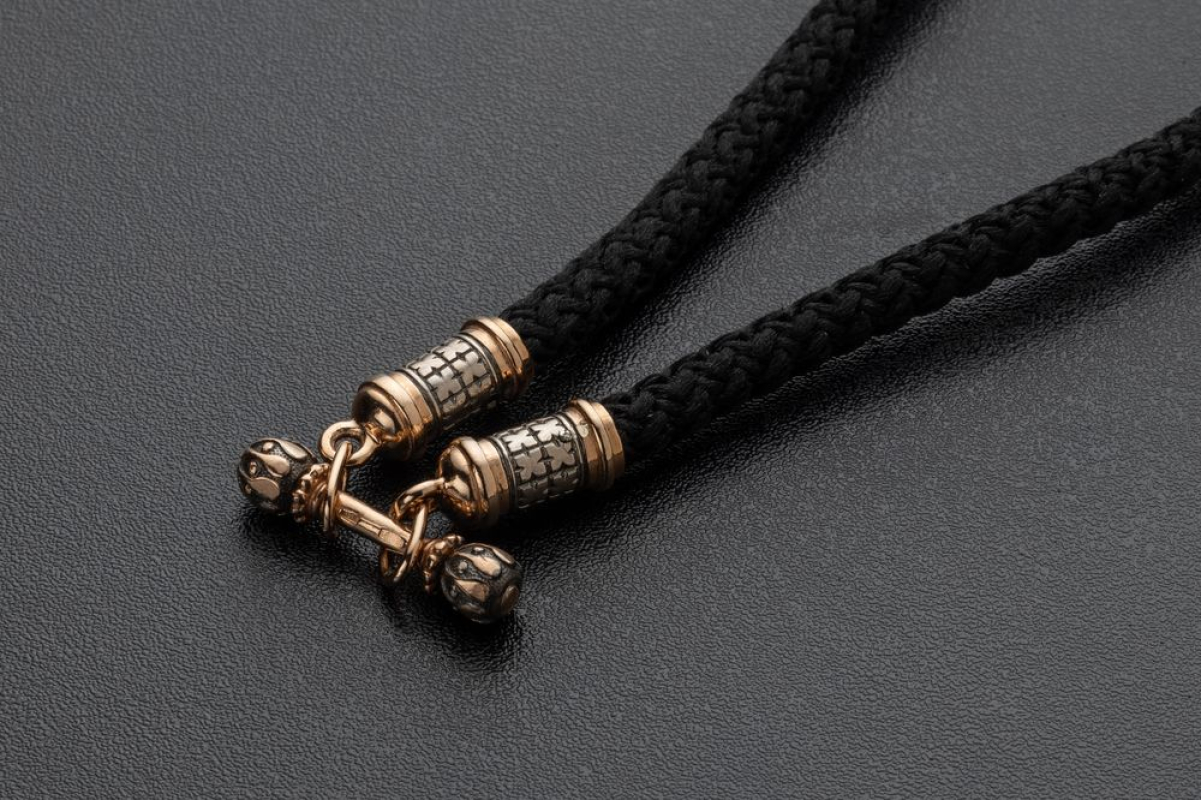 Концевики покрыты позолотой и родиевым покрытием. Шнурок изготовлен из износостойкого материала, устойчивого к воздействию влаги или ультрафиолетовых лучей, практически не мнётся, лёгкий и гибкий, не подвержен воздействию микроорганизмов и насекомых.