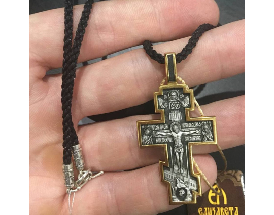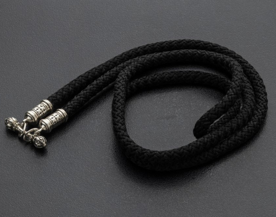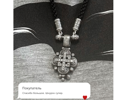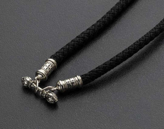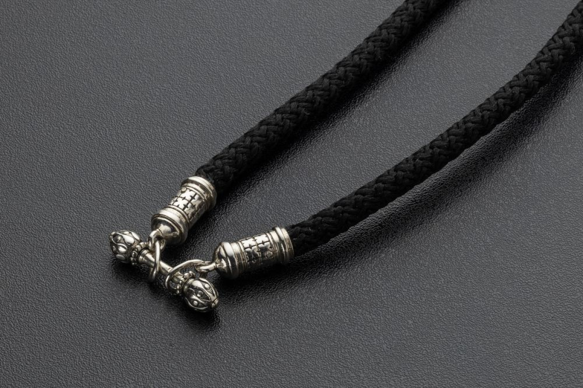 Текстильный шнурок с концевиками цилиндрической формы и переходником из серебра 925 пробы. Переходник выполняет функцию надежного замочка.  Гайтаны с подобным замком довольны комфортны при надевании и ношении изделий.