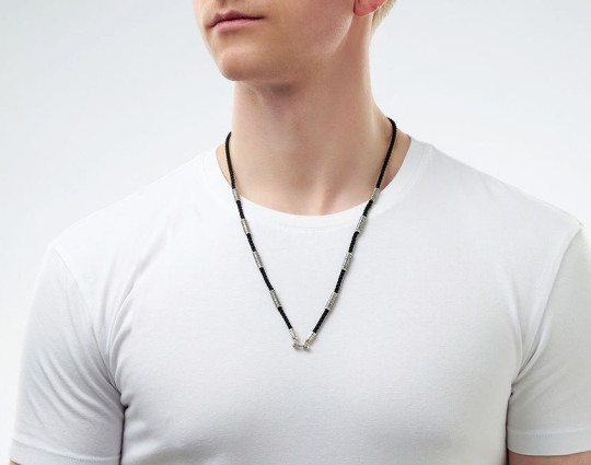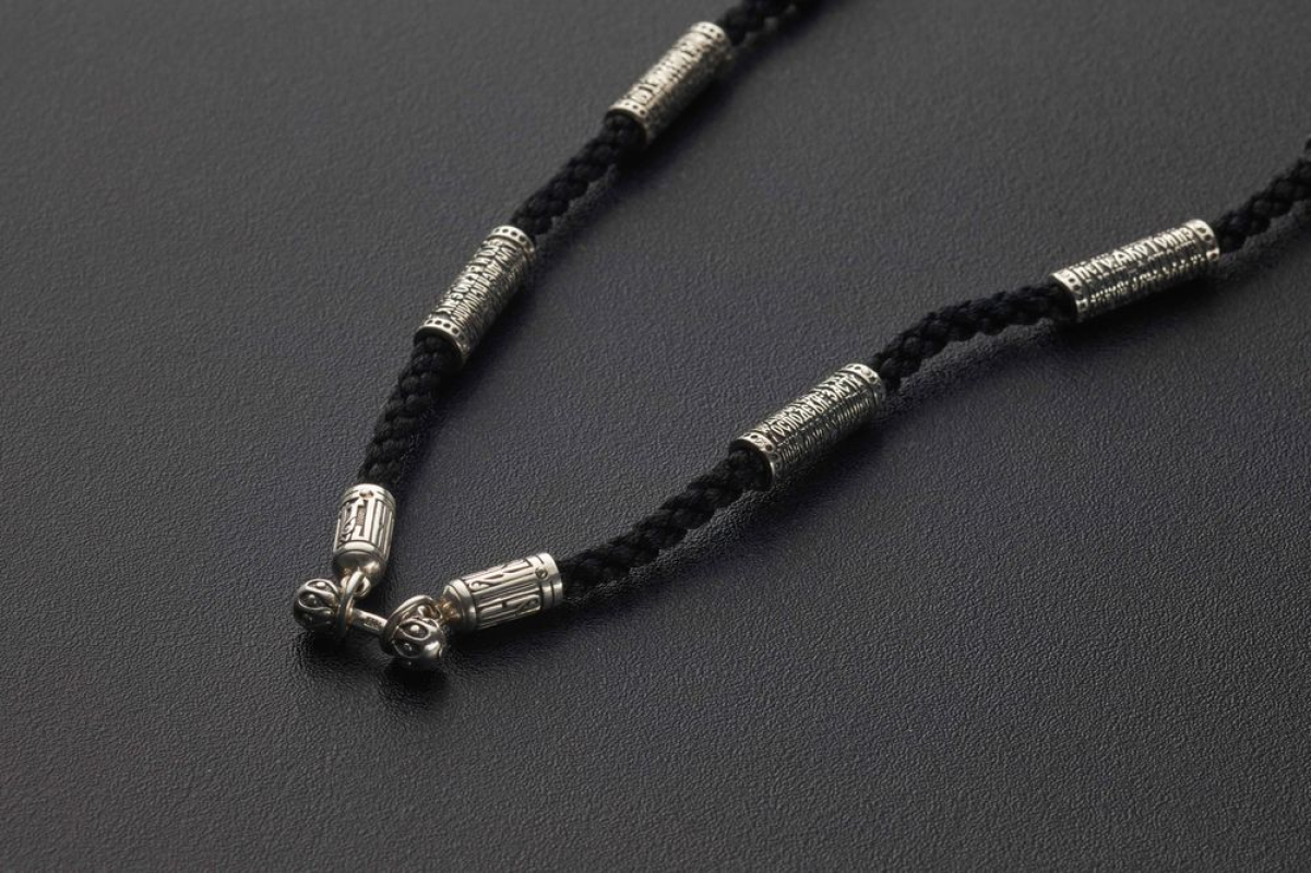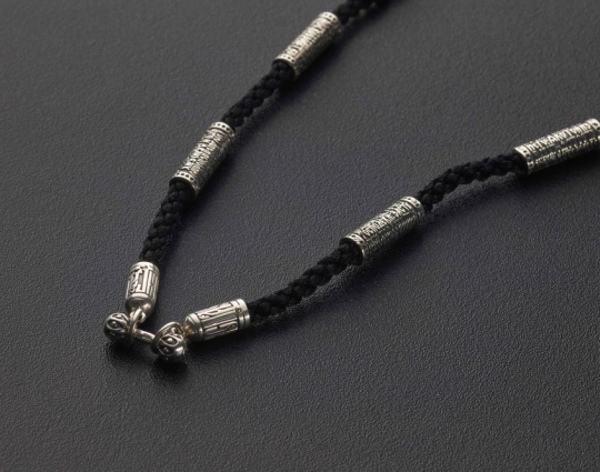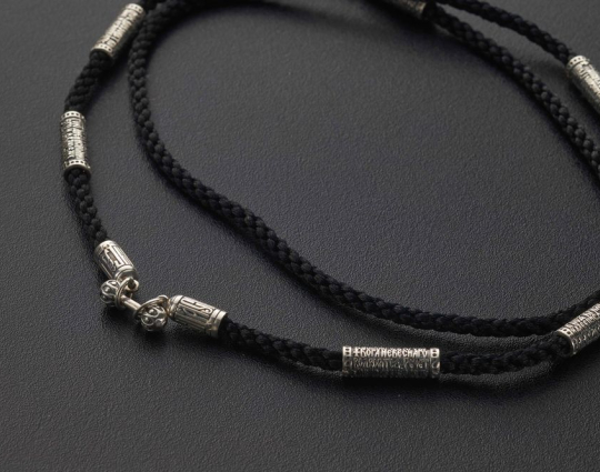 На плотном текстильном шнурке с приятным тактильным ощущением находятся серебряные бусины с текстом 90 псалма. Это выражение веры и надежды каждого человека на помощь Господа в самые трудные времена, во время страхов и сомнений.