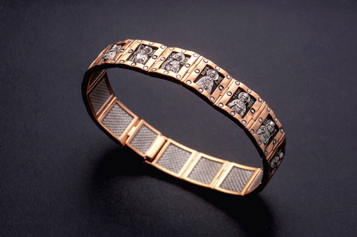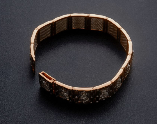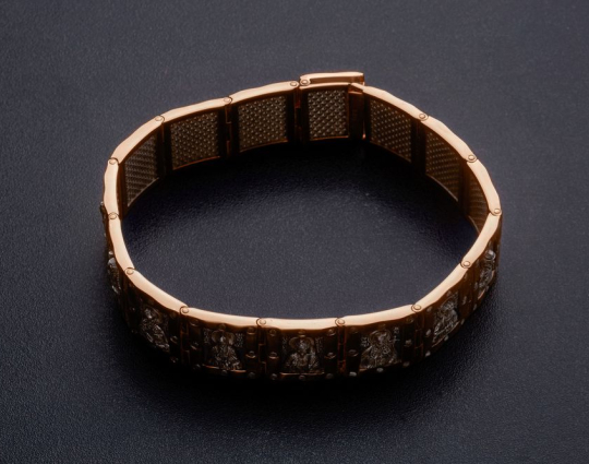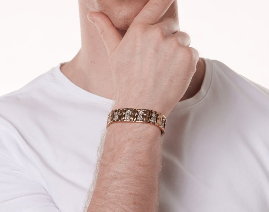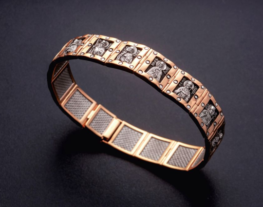 Массивный браслет из золота, в каждом звене которого изображены Святые мужи. Они выбраны не случайно, ведь мужчины по определению Бога, должны быть покровителями, защитниками и добытчиками для своей семьи, а Святые помогают им справляться с их миссией и не забывать про Бога. Они изображены серебром на черненом фоне. Это придает браслету еще больший оттенок мужественности.