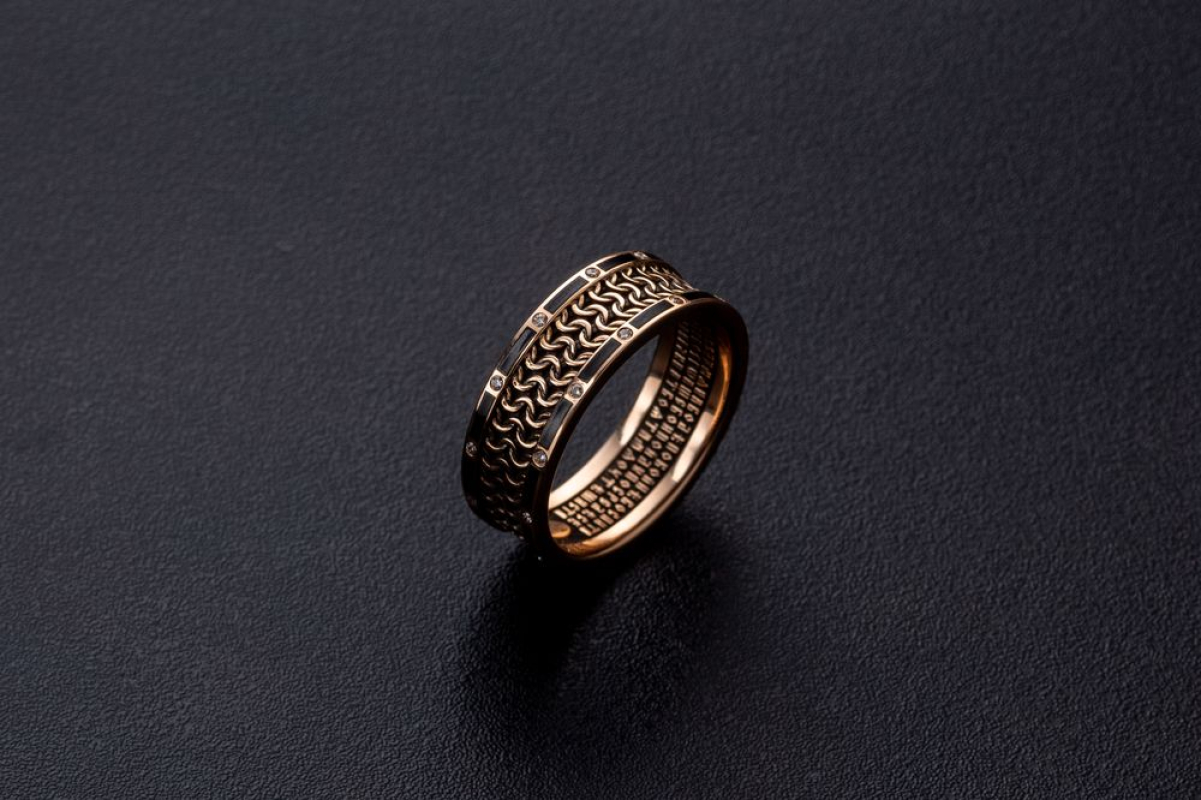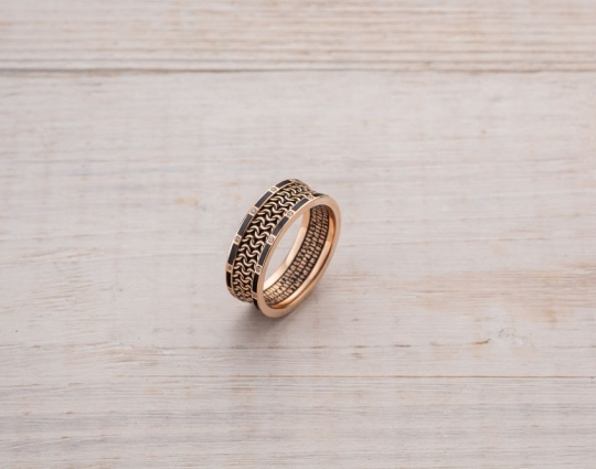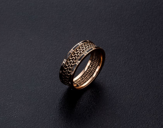 Православное кольцо из красного золота с черной эмалью. По краю окружности кольца размещены 26 бриллиантов.