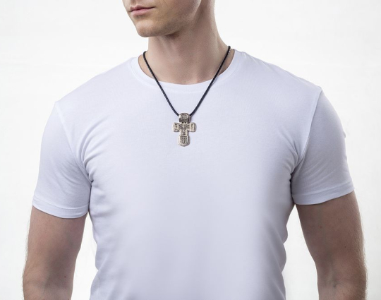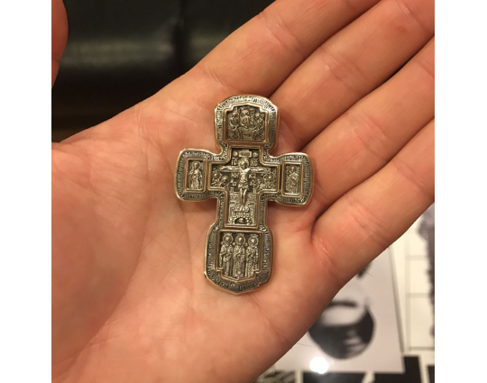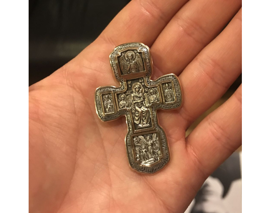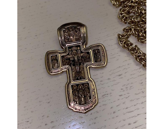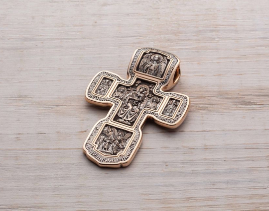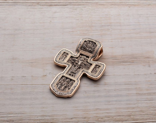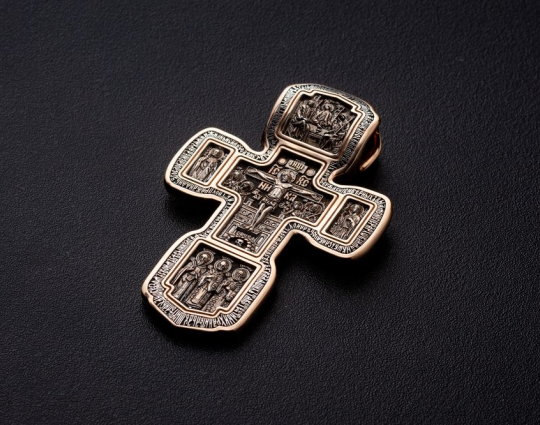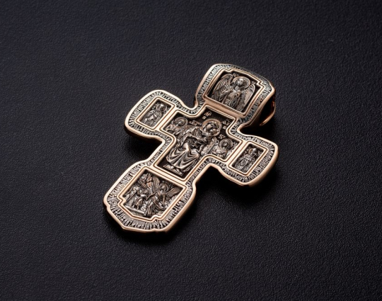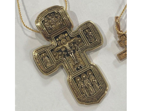 Золотой крест с изображением в центральной части Распятия Христова и тех Святых, которые были рядом с Ним в тот момент. Возле Распятого Иисуса-самые значимые для верующих иконы: Святая Троица, Три Спасителя Вселенских. По бокам, на горизонтальной планке - иконы Святого Николая и Мученика Трифона. По контуру ювелирное изделие огибают слова-обращения к Богу и тонкий позолоченный кант.